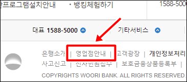 직접, 우리은행 홈페이지로 가서 주소가 있는 곳을 찾아 가려면, PC 버전으로 우리은행 홈페이지에 들어간 후, 아래로 내려오면 영업점 안내가 있습니다. 그곳을 선택하시면, 아래처럼 우리은행 영업점, 자동화코너 위치등을 확인할 수 있는 지도가 나옵니다.