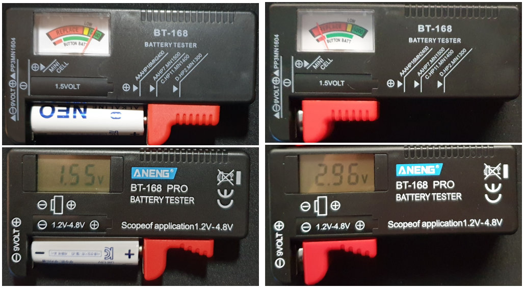 다이소에서 구입한 NEO라고 적힌 무수은 무카드뮴 1.5V 네오 건전지와 수은전지(단추형 건전지)를 디지털 측정기와 아날로그 측정기에서 측정한 상태입니다.