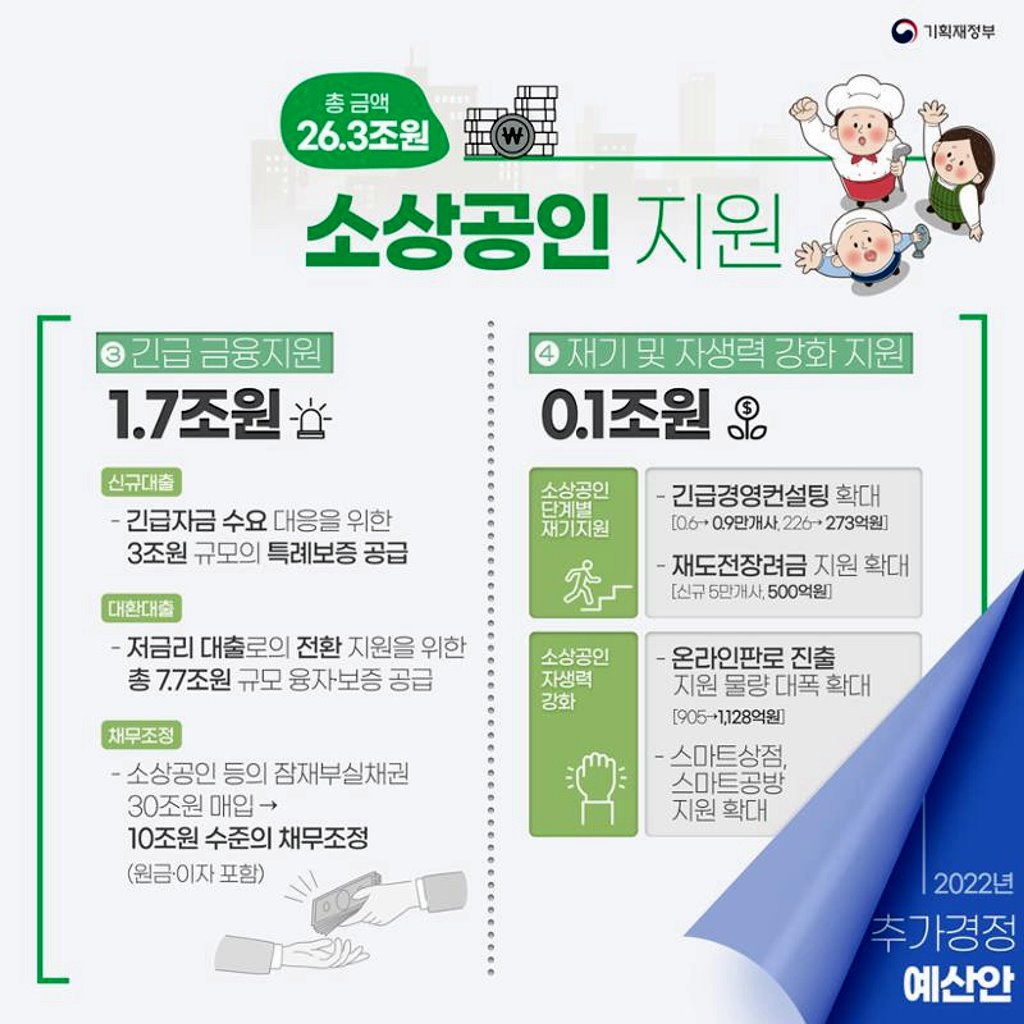 기획재정부 홈페이지에 소상공인 손실보전금, 손실보상 제도 개선, 금융지원 및 취약계층 긴급 생활안정 지원등 2022년 추가경정 예산안이 올라와 있어서 알아 두면 좋을 것 같아 공유해 봅니다.