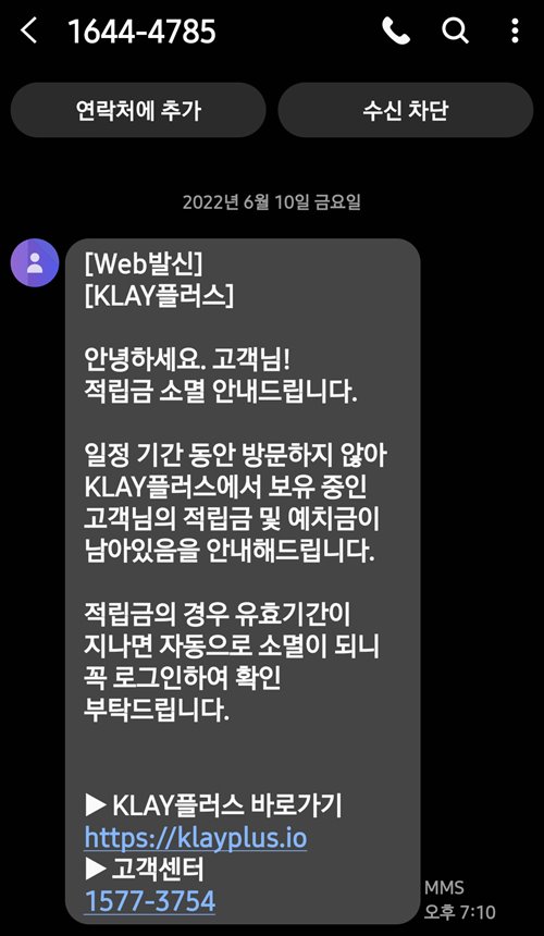 KLAY플러스 문자 내용을 보면은 정말이지 깜밖 속아 넘어갈 수 있습니다. 요즘 적립금과 예치금이 돈과 관련있다보니... " 어? 내 예치금이? 적립금이 있다고? " 라고 판단할 수 있습니다.
