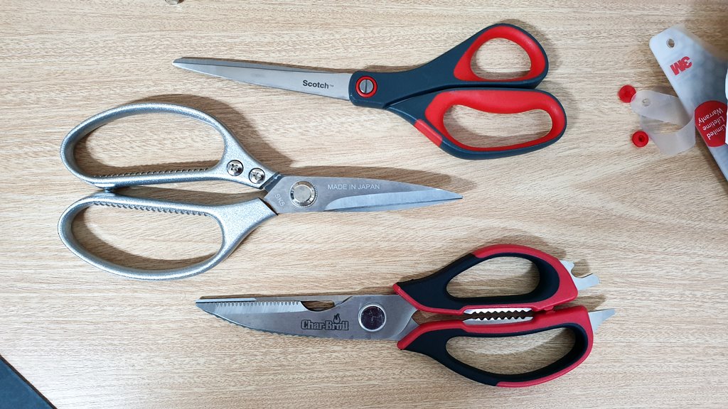 ※ 위 - 11번가 아마존(11마존)에서 주방용으로 구입한 스카치 정밀 가위 20.3 cm, 8인치, 그레이/레드 가위(Scotch Precision Scissor 8-Inches, Grey/Red) , 중간 - 알리익스프레스 구입한 SK5 MADE IN JAPAN 으로 각인된 중국 가위, 아래 - 11번가 아마존(11마존)에서 캠핑용으로 구입한 Char-Broil Comfort Grip 고기 가위
