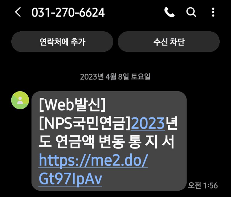2023년 4월 8일 오전1시 56분, NPS국민연금에서 2023년 연금액 변동통지서 문자 메세지 받았는데, 피싱문자(스미싱)로 의심이 됩니다.